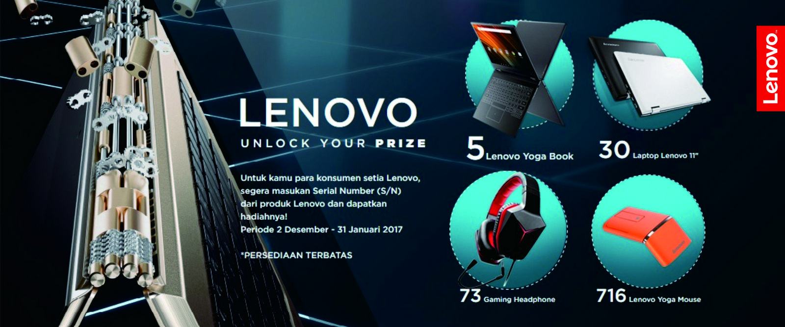Serial number yang berlaku untuk mengikuti promo ‘Unlock Your Prize’ adalah serial number dari pembelian produk Lenovo selama periode 15 Nov 2016 - 31 Jan 2017. Promo ini membuktikan komitmen Lenovo untuk membantu pengguna meningkatkan produktivitas dalam dunia kerja dengan produk yang inovatif dan performa yang tinggi.