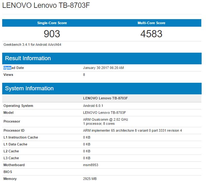Baru kemarin KabarLenovo bikin berita tentang munculnya tablet baru ehh sekarang keluar lagi. Kali ini info dari situs Geekbench adalah model TB-8703F yang diperkirakan adalah Lenovo Tab3 8.