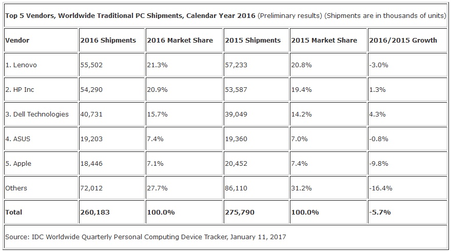 Untuk Laporan tahunan, pengiriman PC tradisional merosot ke 260 juta unit, turun 5,7% dari tahun 2015. Q1 2016 masih dibatasi adanya persediaan di perorangan dan komersial, free Windows 10 upgrade, dan penggantian unit PC komersial akibat berhentinya dukungan terhadap Windows XP. Namun pertengan 2016 dan khusunya Q4 penjualan PC mulai bergerak positif. Permintaan stabil dari sektor komersial, meredanya tekanan pasar smartphone/tablet menjadi faktor mulai meningkatnya permintaan PC di Q4.