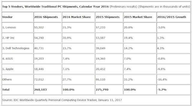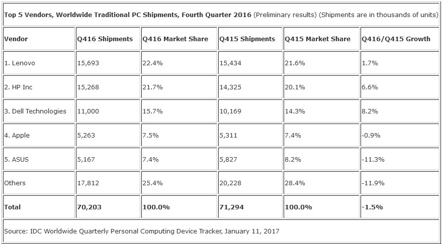 Lenovo menduduki peringkat pertama Q4 2016 dengan penjualan sebesar 15,6 juta unit, naik 1,7% dari tahun 2015 sebesar 15,4 juta unit. Lenovo meraih pangsa pasar 22,4% dari total pengiriman PC di Q4 2016.