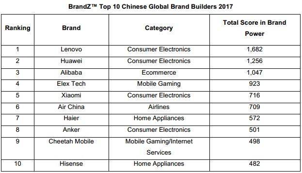 Lenovo meraih posisi pertama di bagian atas daftar 30 perusahaan China dengan hasil maksimal 1682 poin. Sebanyak 167 merek berpartisipasi. Studi ini mengungkapkan Kantar Millward Brown mengikuti tren: penurunan sikap negatif terhadap merek Cina di dunia dan untuk meningkatkan kesadaran mereka di segmen elektronik konsumen. Para ahli juga menemukan bahwa perusahaan China tumbuh lebih cepat dari Barat dan memiliki prospek besar untuk pengembangan Internet.