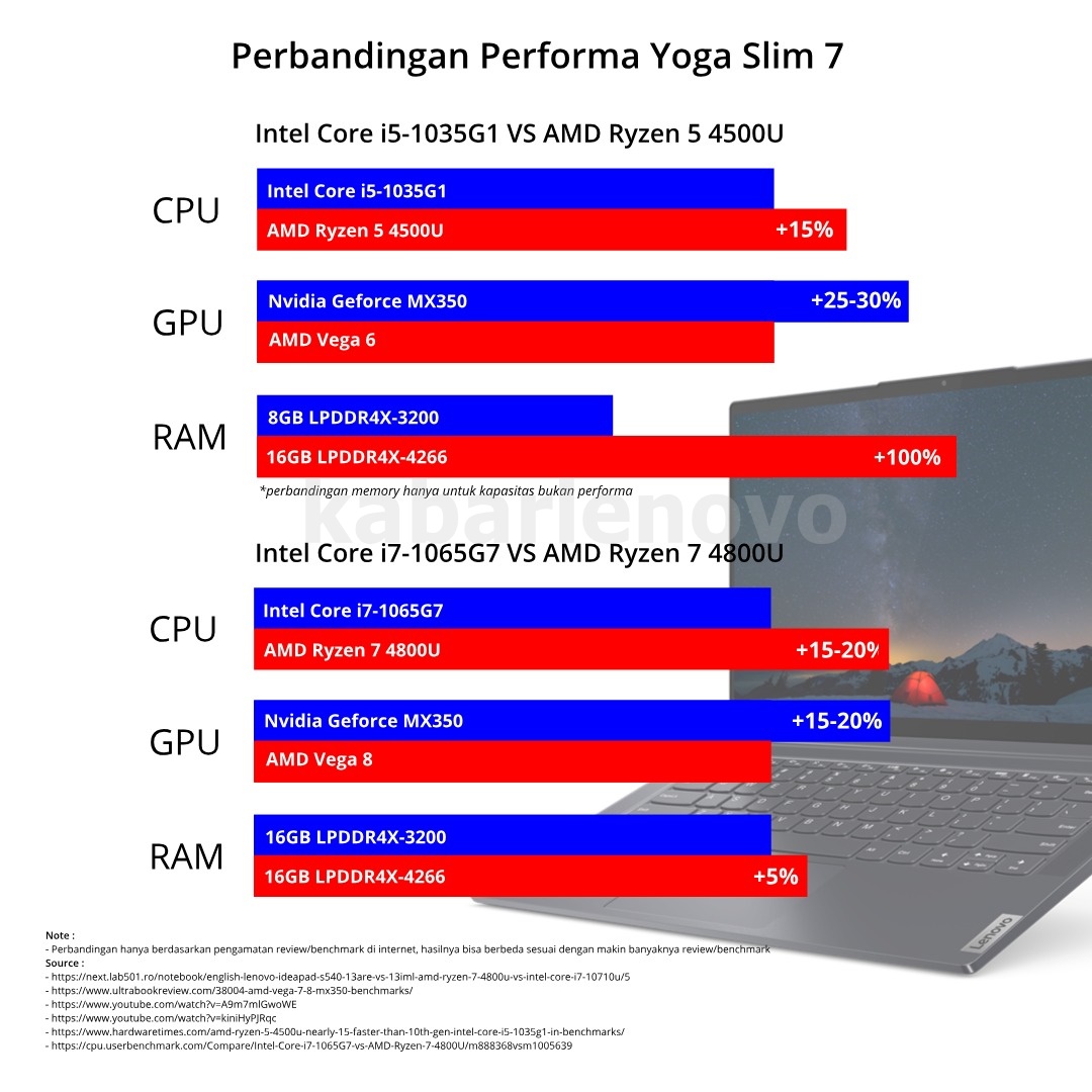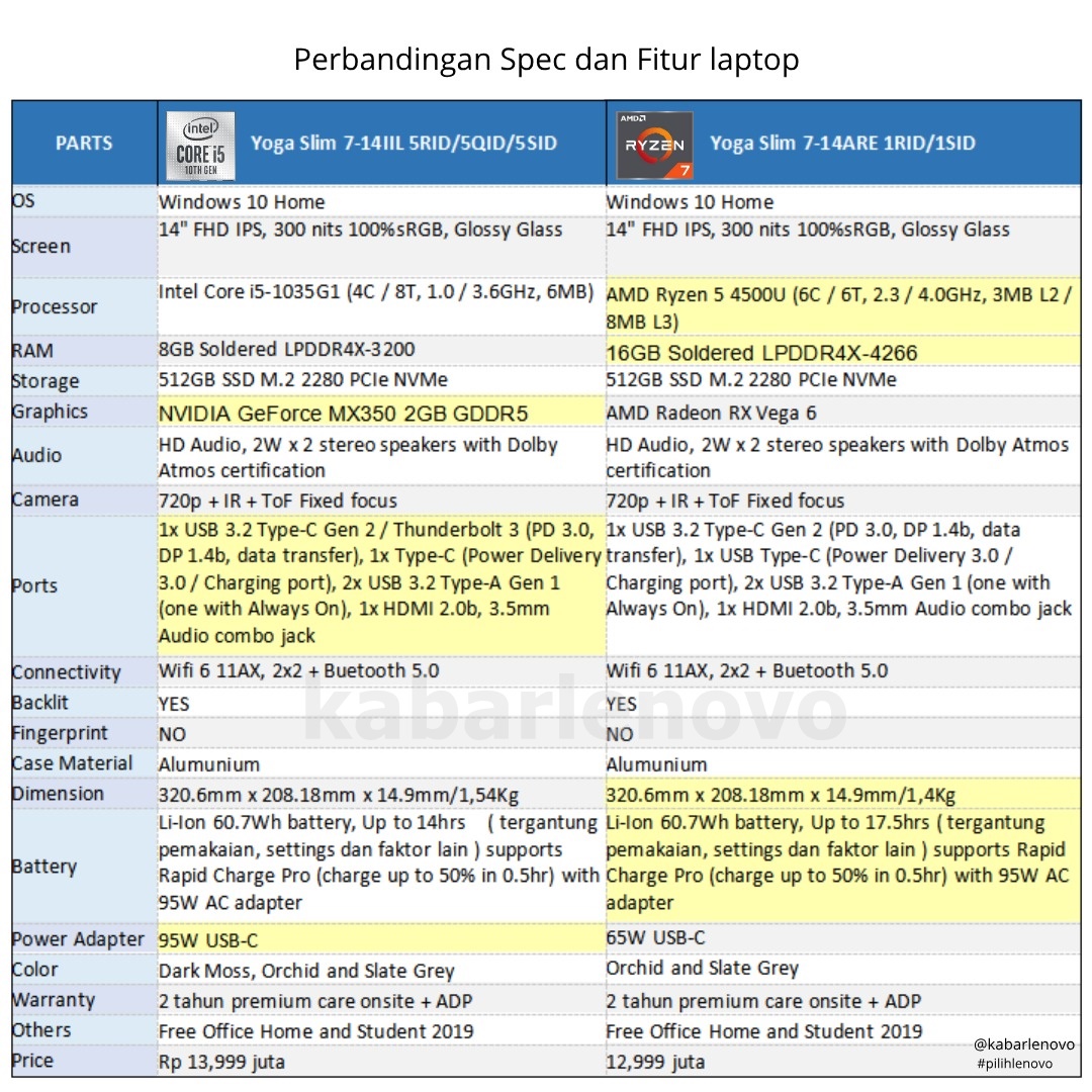 Yoga Slim 7 yang hadir di Indoensia membawa 4 SKU yang terdiri dari Intel series ( Core i5 dan i7 ) dan AMD series ( Ryzen 5 dan Ryzen & ). keemapat SKU ini sangat bersaing satu sama lainnya dikarenakan spesifikasi dan harga yang ditawarkan memiliki kemiripan.